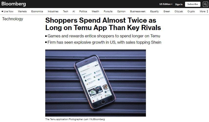 據《華爾街日報》報道,美國市場增長最快的兩大購物平臺分別是Shein和Temu。Temu目前是美國訪問量排名第四的零售網站,僅次于亞馬遜、沃爾瑪和易趣。彭博社援引研究公司 Apptopia的數據稱,購物者在中國重量級在線購物巨頭Temu上花費的時間,幾乎是亞馬遜等主要競爭對手應用程序上的兩倍。