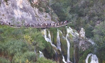 克羅地亞普利特維採湖國家公園是中國九寨溝國家級自然保護區的“姐妹”自然遺產地。兩者同屬喀斯特地貌,是世界非常罕見的冷水鈣華景觀。中國科學院成都生物研究所與克羅地亞薩格勒布大學合作成立“中國—克羅地亞生物多樣性和生態係統服務‘一帶一路’聯合實驗室”,為兩國世界自然遺產地生態保育作出重要貢獻。圖為當地遊客在普利特維採湖國家公園參觀。