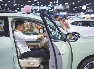 在2023年舉辦的第四十屆泰國國際汽車博覽會上,中國品牌電動汽車訂單量在所有參展品牌中名列前茅。在中國品牌的強勁拉動下,參展電動汽車訂單量首次超越燃油汽車訂單量。圖為當地參觀者在車博會上試駕中國品牌電動汽車。