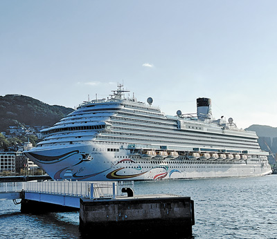 1月7日,國產首艘大型郵輪“愛達·魔都號”搭載3000多名賓客,完成7天6晚的商業首航。圖為商業首航中停靠港口的“愛達·魔都號”郵輪。