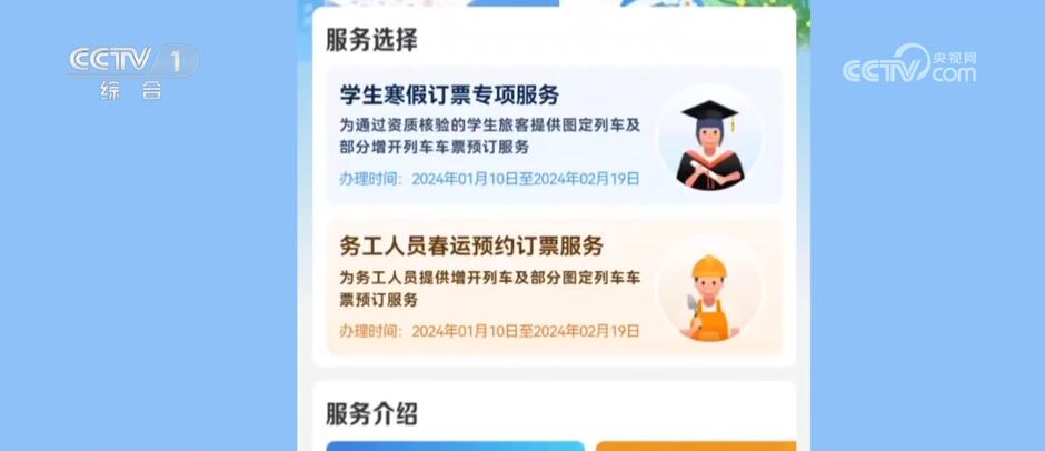 今年春運,鐵路部門推出預約購票和預填購票兩項購票新方式,預約購票功能專門針對學生和務工人員。符合條件的學生旅客(已通過學生優惠資質核驗且有剩余優惠乘車次數)可通過“學生寒假訂票專項服務”專區預約購買春運期間的火車票。已通過實名制核驗的務工人員可通過“務工人員春運預約訂票服務”專區預約購買春運期間火車票。