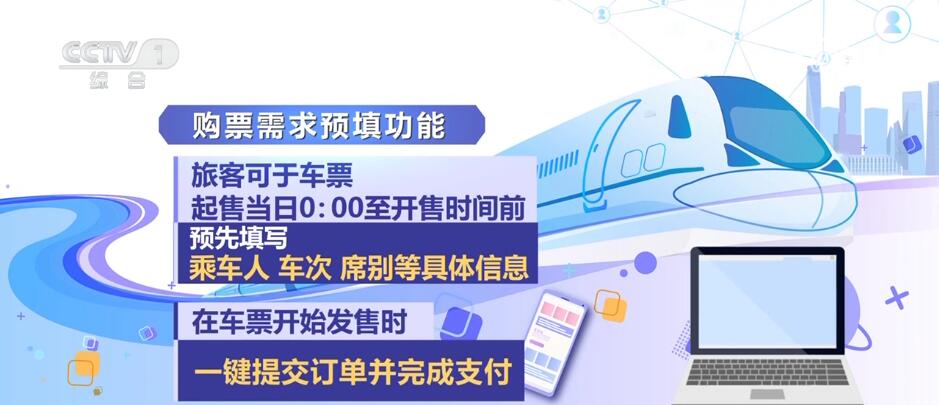 鐵路部門今年還增加了購票需求預填功能,旅客可于車票起售當日0:00至開售時間前,預先填寫乘車人、車次、席別等具體信息,在車票開始發售時一鍵提交訂單並完成支付。