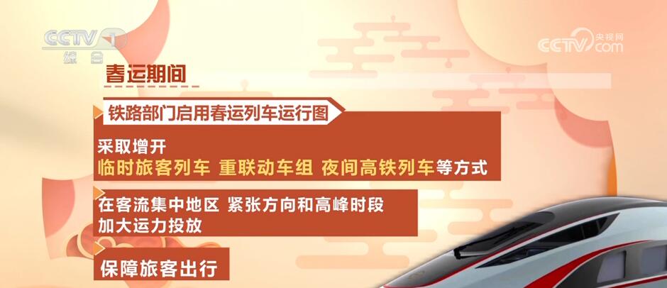 春運期間,鐵路部門啟用春運列車運行圖,採取增開臨時旅客列車、重聯動車組、夜間高鐵列車等方式,在客流集中地區、緊張方向和高峰時段加大運力投放,保障旅客出行。國鐵濟南局春運期間安排臨客超90對,其中開行去往北京、上海、石家莊、哈爾濱、福州等方向跨省臨客47對。國鐵武漢局春運首日加開臨客49對,哈爾濱鐵路部門安排開行臨客列車74對,太原鐵路部門安排開行臨客列車64對。