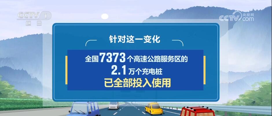 今年公路出行還有一個新變化,就是在小客車出行當中,新能源車輛佔比增多。針對這一變化,目前,全國7373個高速公路服務區的2.1萬個充電樁已全部投入使用。