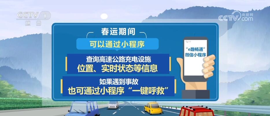 為提升今年春運服務,交通運輸部還上線“e路暢通”微信小程序,春運期間,大家可以通過小程序,查詢高速公路充電設施位置、實時狀態等信息,如果遇到事故,也可通過小程序“一鍵呼救”。