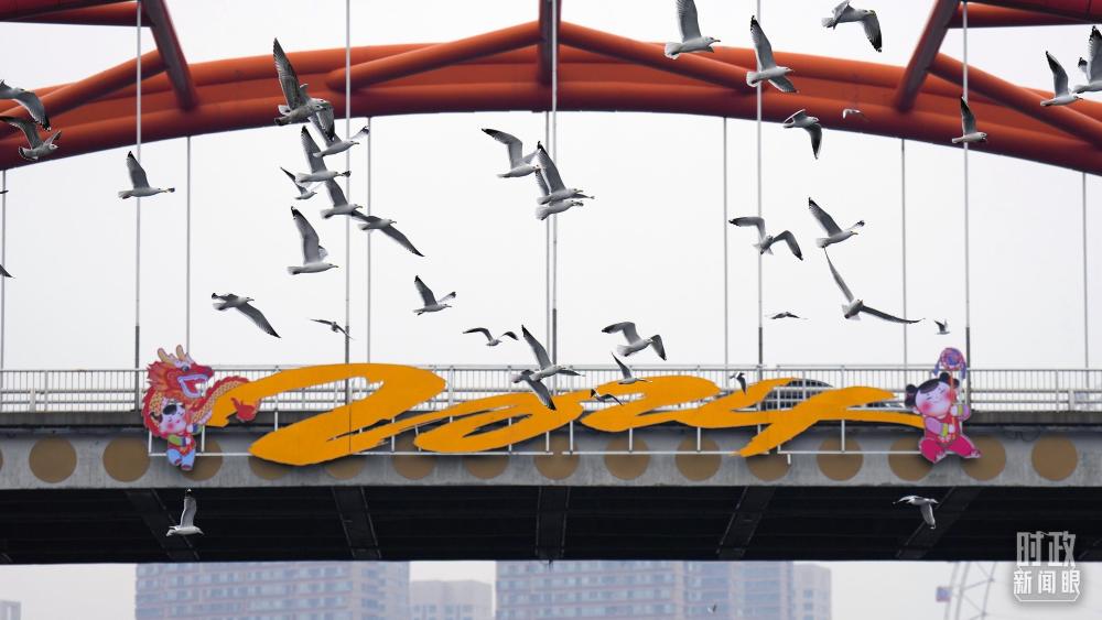 △天津金剛橋,成群的海鷗飛越海河。(總臺國廣記者李晉拍攝)