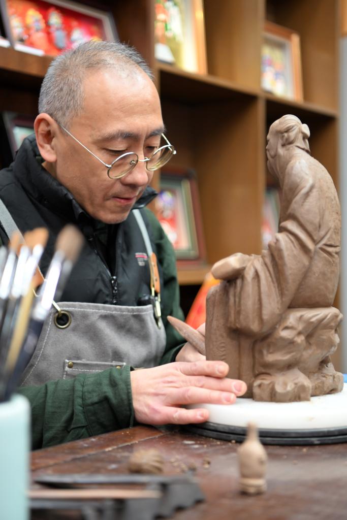 近日,在天津古文化街,泥人張制作部的老師傅劉強在店內工作。新華社記者 李然 攝