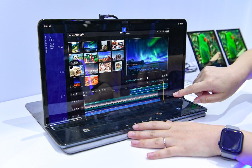 在“2023世界顯示產業大會新型顯示創新成果展”現場,工作人員展示京東方折疊顯示屏。新華社記者唐文豪 攝