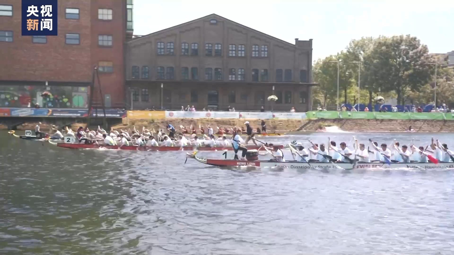 總臺記者 余鵬:現在在我身後的,是德國杜伊斯堡趣味龍舟賽。龍舟上傳來鼓聲陣陣,運動員們飛槳逐浪、奮勇爭先。岸邊圍滿了加油助威的觀眾,人們盡情享受比賽帶來的激情,這場龍舟賽也變成了老少皆宜的聚會。