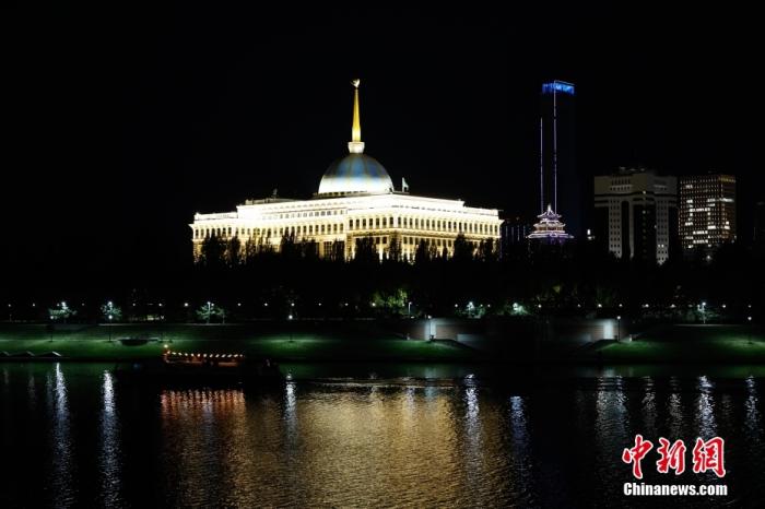 資料圖為7月1日傍晚阿斯塔納伊希姆河畔的總統府。