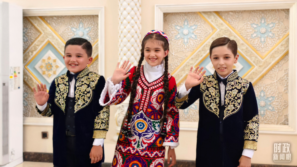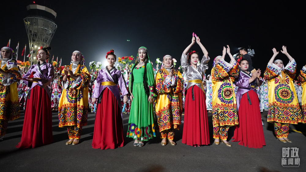 1500多名身著民族盛裝的塔吉克斯坦青年,表演富有濃鬱特色的中塔歌舞,揮舞中塔兩國國旗,表達對中國領導人的熱烈歡迎。