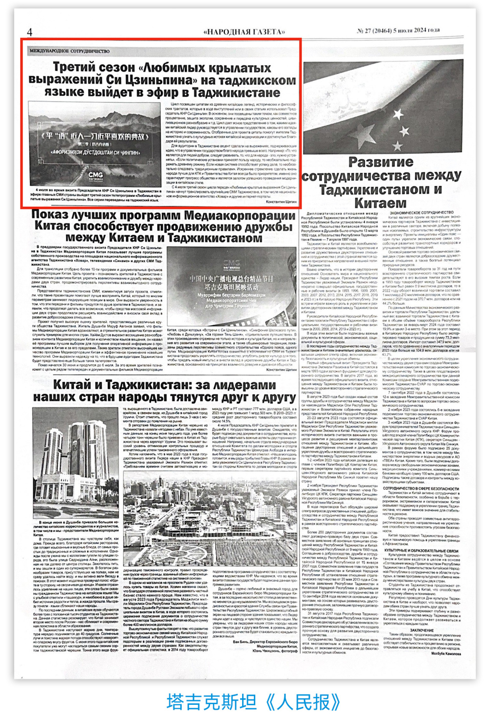 塔吉克斯坦最有影響力的報紙《人民報》5日刊發了《平“語”近人——習近平喜歡的典故》第三季(塔吉克語版)開播消息。塔吉克斯坦伊斯梅爾快訊、瓦罕晚報,“今日哈薩克斯坦”通訊社、俄羅斯伏爾加格勒郵報、俄羅斯聖彼得通訊社、土庫曼斯坦卡拉庫姆經貿在線等亞歐地區和全球近百家主流媒體對節目播出進行了報道。