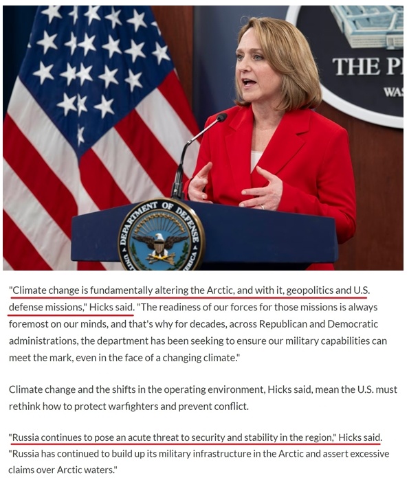在發布這份文件時,美國國防部副部長希克斯在簡報會上公然聲稱,俄羅斯對北極地區的安全與穩定構成“嚴重威脅”。為此,美國必須制定戰略並確保美軍做好準備,以減輕在北極地區發生潛在突發事件的風險。