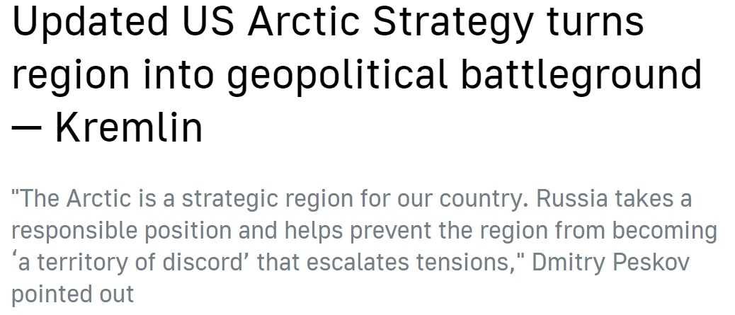 在被問及對美國這份北極戰略報告的看法時,俄羅斯總統新聞秘書佩斯科夫指出,美方報告顯示出對抗色彩,而俄羅斯一直在北極問題上採取負責任的立場,“為確保北極不會成為紛爭和局勢緊張地區做出貢獻”。