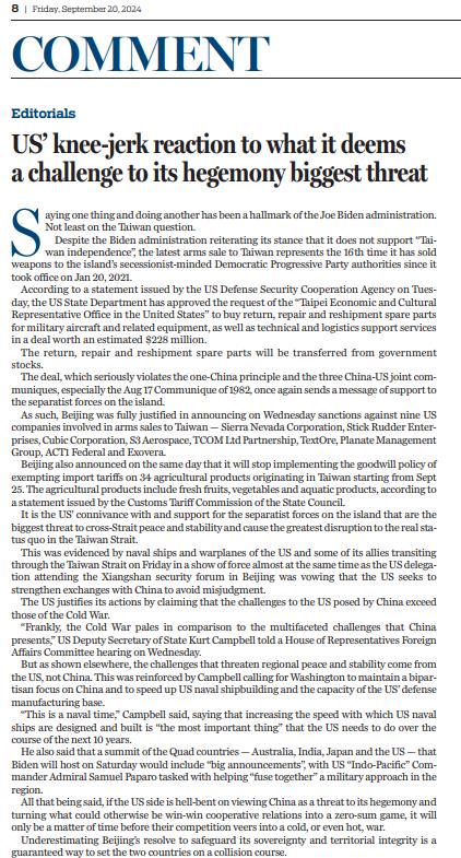 原文標題:US' knee-jerk reaction to what it deems a challenge to its hegemony biggest threat