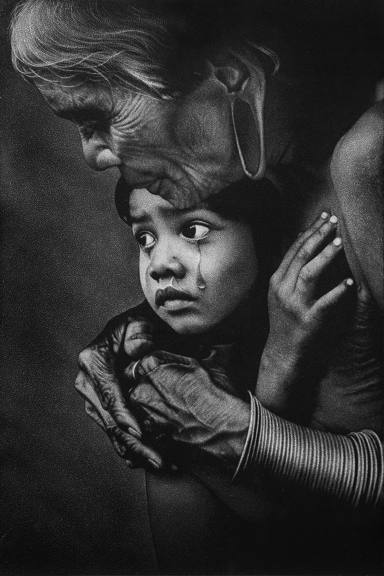 李亞華:這幅作品取材于海灣戰爭時的一張照片,我很悲憐這個小女孩,所以就萌生了給她做一幅作品把這幅畫凝固起來的想法。這滴眼淚看起來是立體的,但其實它是平面,是在黑灰白過渡下的一個更明顯的對比。因為這幅作品已經被我們國家一所在建的非遺博物館徵集收藏,所以我就想再做一幅,但是好幾次都沒成功,眼淚的灰度做不出來了。