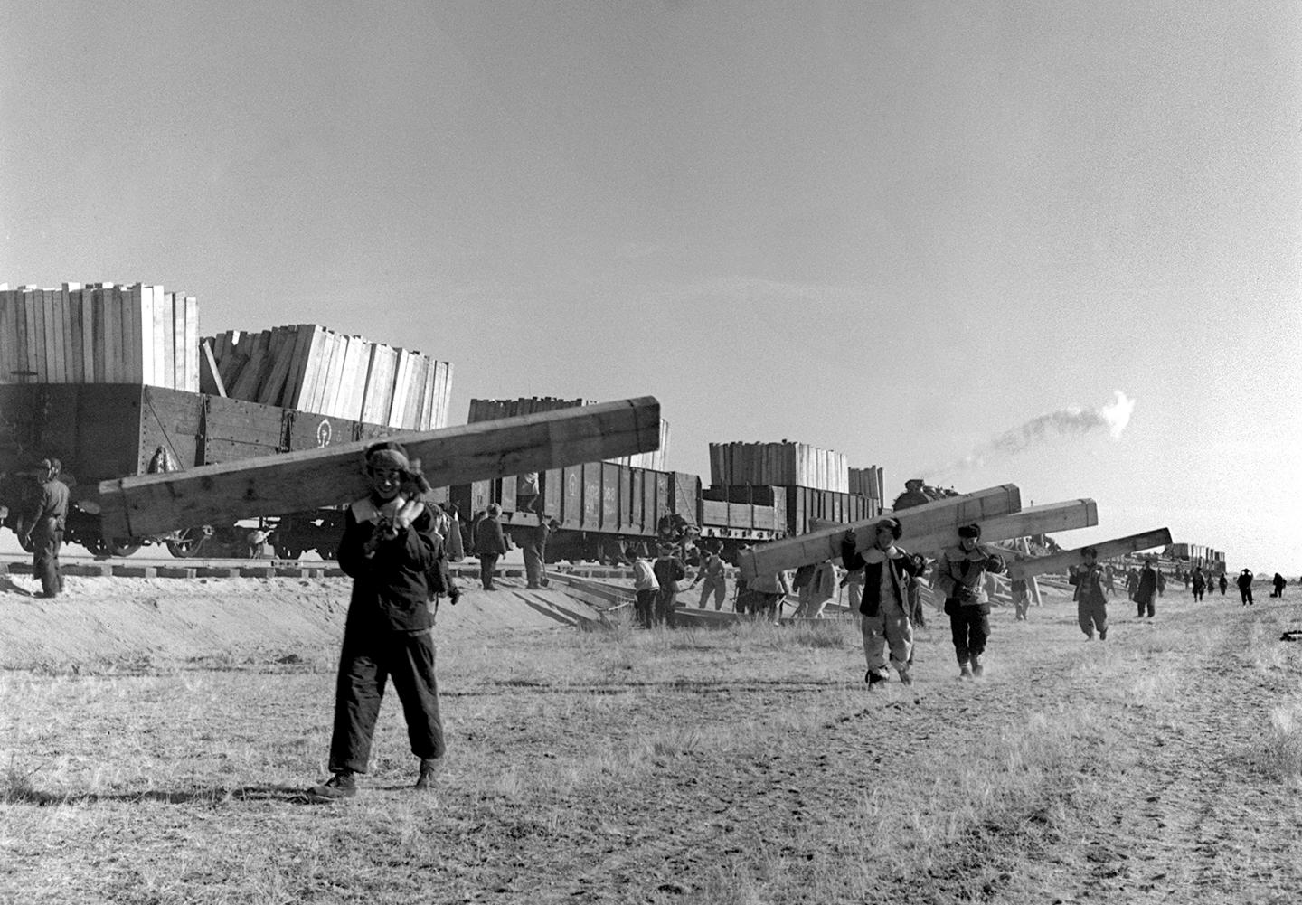 在內蒙古集二線鐵路建設中,工人扛著枕木,前往鋪軌地點。集二線鐵路1953年5月開工建設。新華社記者 鄒健東 攝