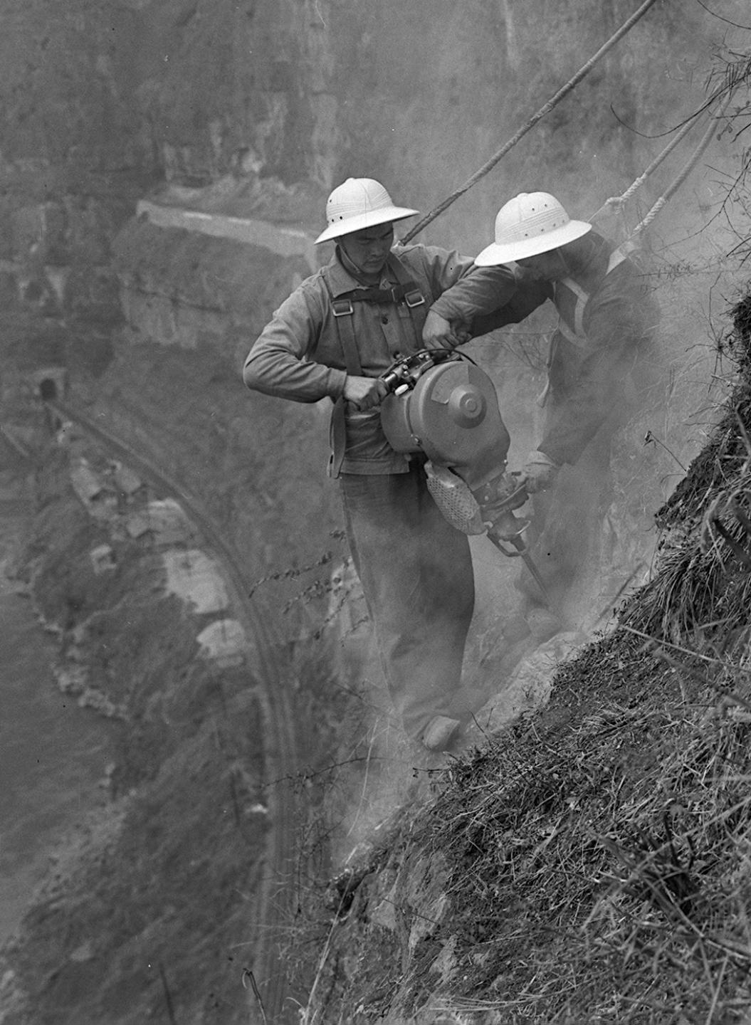 1974年3月,四川西昌鐵路分局烏斯河工務段工人排除大渡河兩側懸崖峭壁上的危岩和孤石,保證成昆鐵路安全通車。新華社記者 李基祿 攝