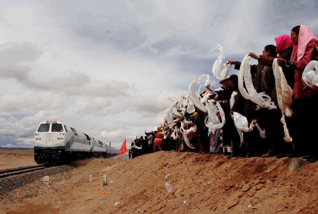 2006年7月1日,青藏鐵路全線通車。在青海沱沱河大橋橋頭,當地群眾歡迎從格爾木出發的“青1”次列車。新華社記者 陳燮 攝