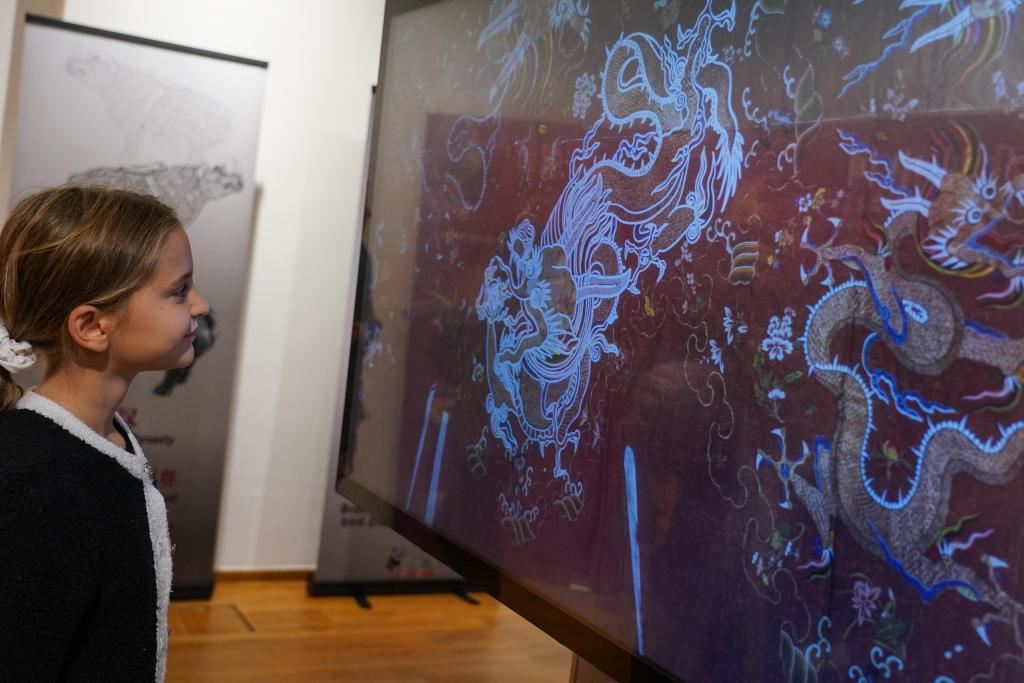 9月27日,在比利時布魯塞爾中國文化中心,觀眾在“看見中國”之《紋樣與色彩:中華工藝之美》數字文化展上參觀。新華社記者 彭子洋 攝