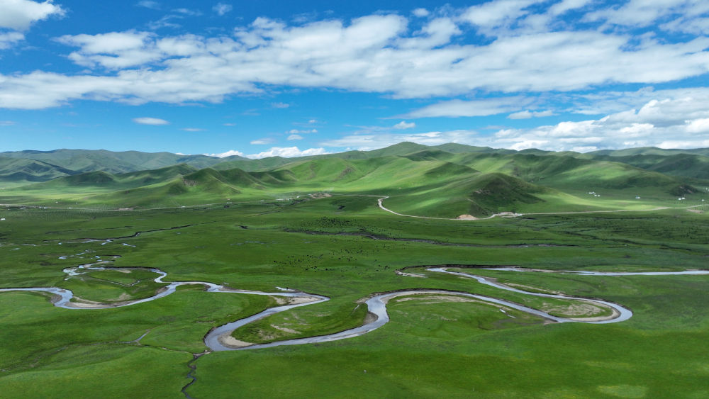 這是甘肅省甘南藏族自治州瑪曲縣阿萬倉濕地景色(2023年7月6日攝,無人機照片)。新華社記者 陳斌 攝