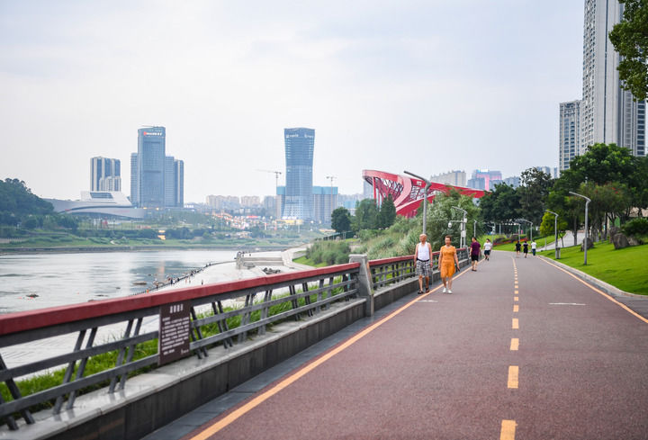 人們在四川省宜賓市三江口長江邊的綠道上散步(2023年6月28日攝)。新華社記者 王曦 攝