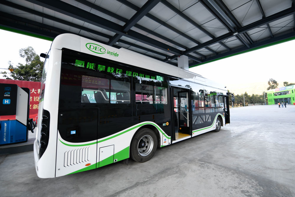 停靠在四川攀枝花加氫站的氫能公交車(2022年11月27日攝)。新華社記者 胥冰潔 攝