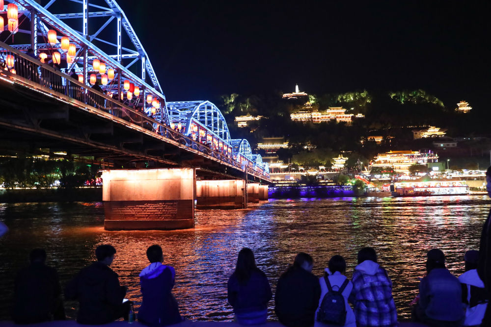 2024年10月4日晚,遊客在黃河蘭州段岸邊欣賞黃河夜景。新華社記者 郎兵兵 攝
