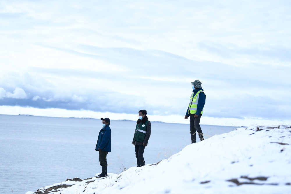 2021年10月20日,在青海省果洛藏族自治州瑪多縣扎陵湖鄉勒那村,三江源國家公園黃河源園區生態管護員在扎陵湖畔巡護。新華社記者 李佔軼 攝