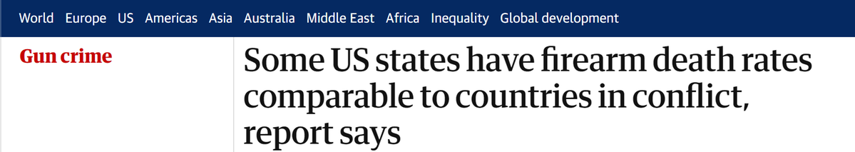 據報道,槍支在2020年躍升為導致美國1至17歲兒童死亡的主要原因,超過了車禍和溺水或窒息等所有其他疾病和傷害原因。與英國相比,美國兒童的槍支死亡率是其72倍,為每百萬人中36.4人死亡,而英國僅為每百萬人中0.5人死亡。