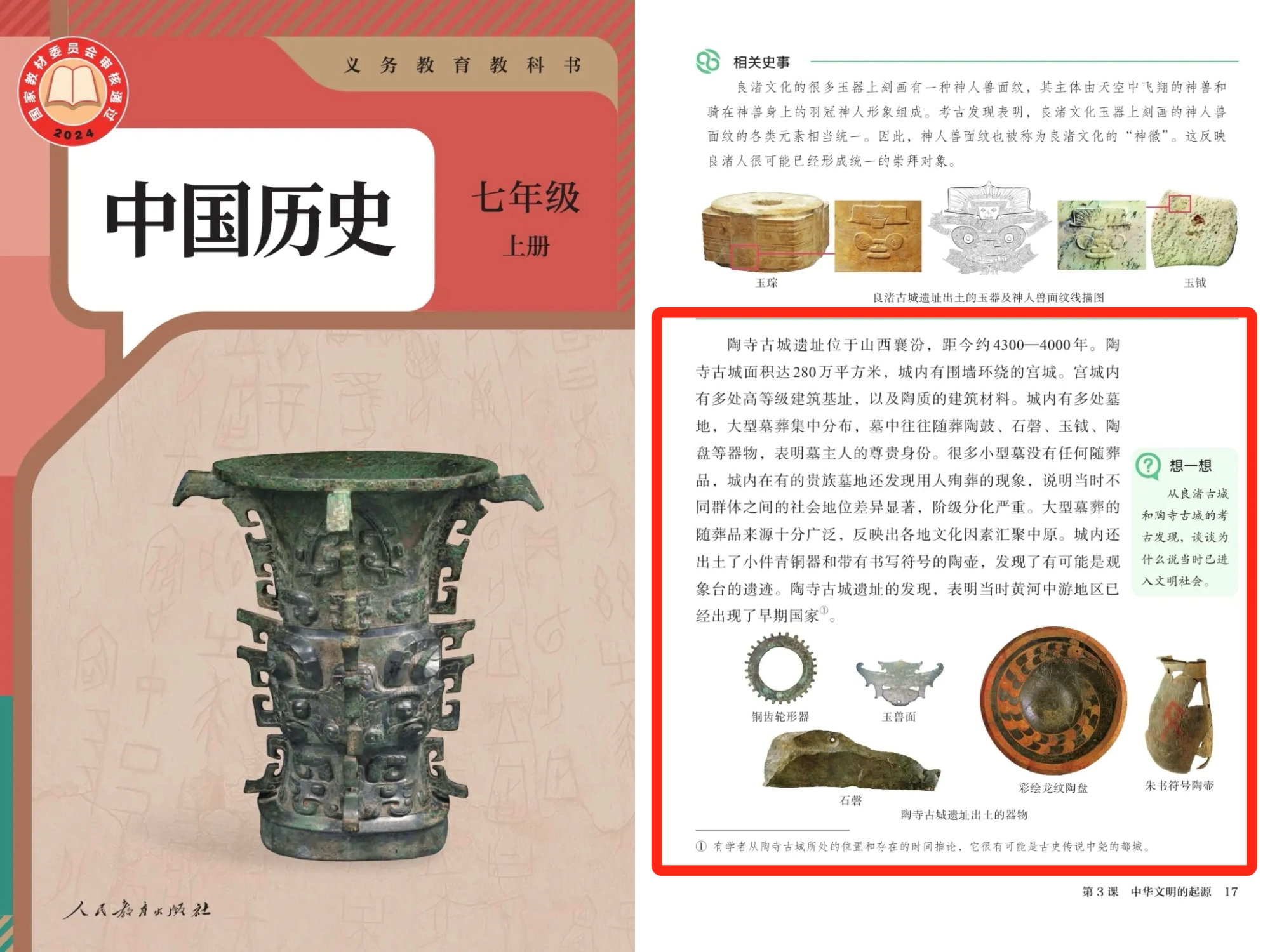 △人教版七年級歷史教材 紅框部分為陶寺遺址相關內容