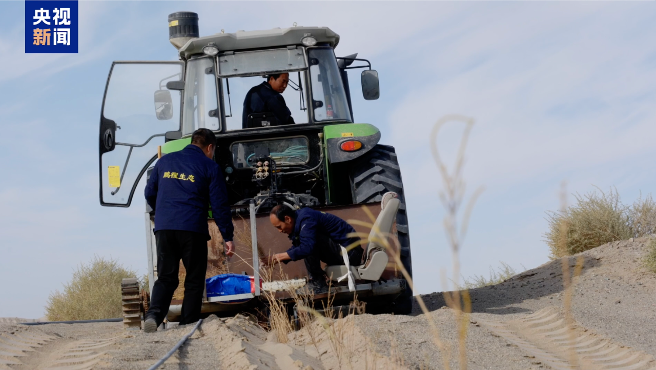今年秋季,為提升工作效率,老兵治沙隊成員全新改良了梭梭苗栽種機,對防沙林進行秋季補植補種。