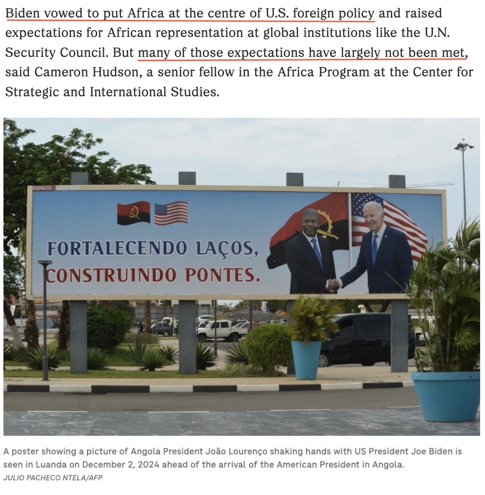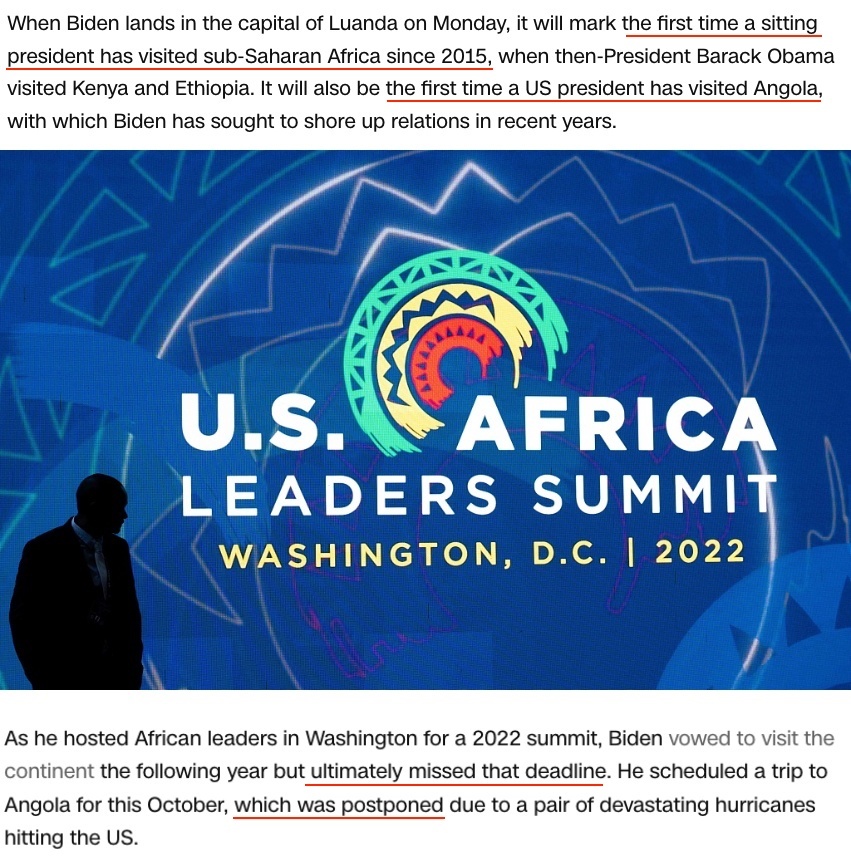 △美國有線電視新聞網報道:這是一場拖了太久的訪問。2022年在華盛頓舉行的美非峰會上,拜登曾承諾2023年訪問非洲,但他食言了。即便是這次原本安排在10月的安哥拉之行也因美國國內發生颶風災害而推遲。