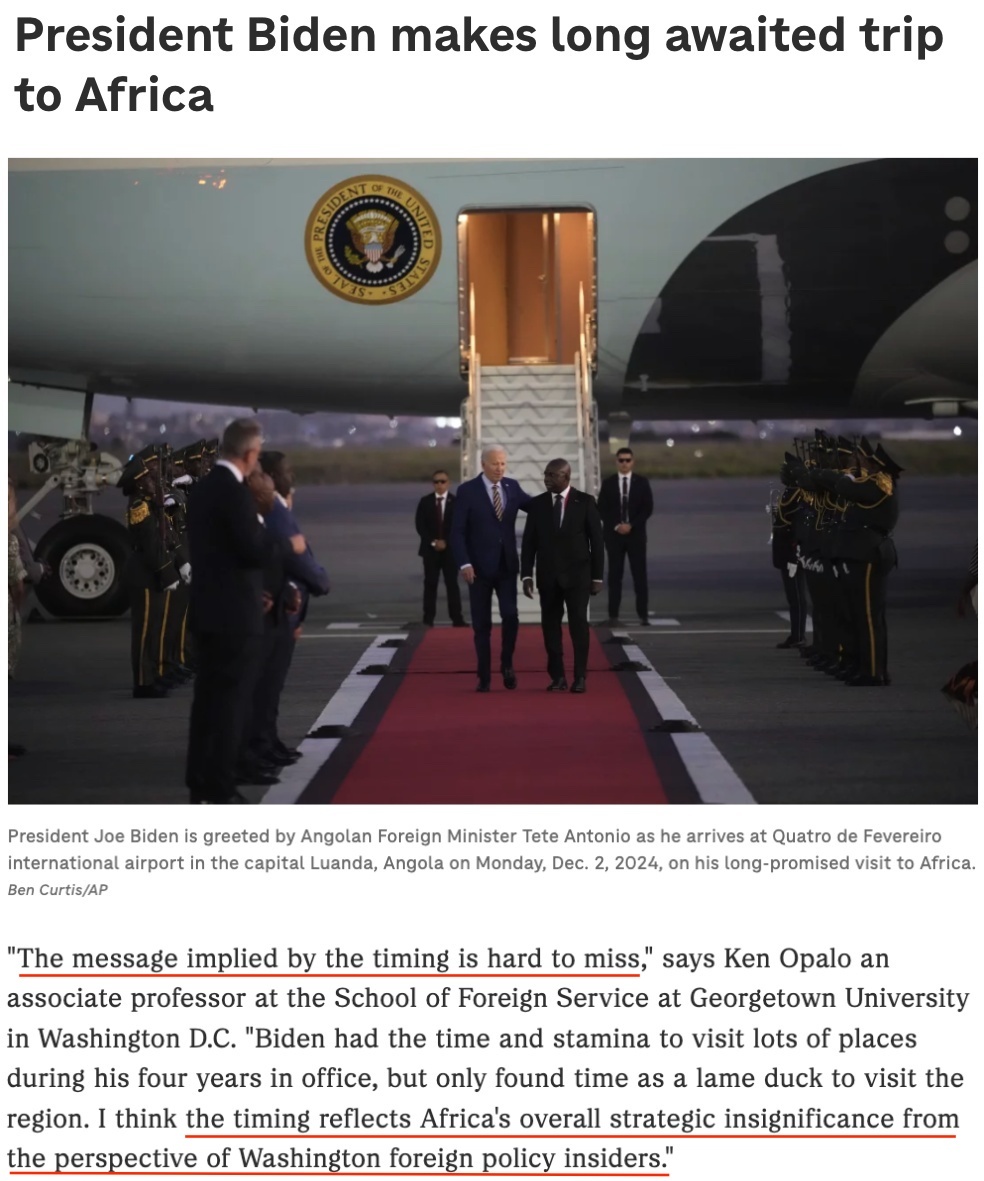 美國華盛頓特區喬治城大學外交學院副教授肯·奧帕羅認為,拜登在即將卸任時才抽出時間訪問非洲地區,“從華盛頓外交政策內部人士的角度來看,這個時機反映了非洲在美國總體戰略中的不重要性”。
