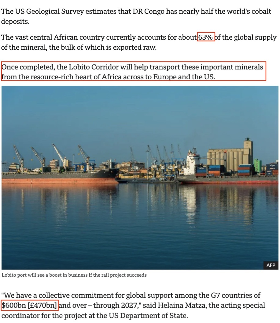 “洛比托走廊”是剛果(金)、讚比亞和安哥拉這三個非洲國家以及美國、其他七國集團(G7)成員國和私人投資者之間的一個聯合項目。這條全長1344公里的鐵路線將剛果(金)的鈷、鋰和銅礦以及讚比亞的銅帶地區連接到安哥拉的大西洋港口城市洛比托。