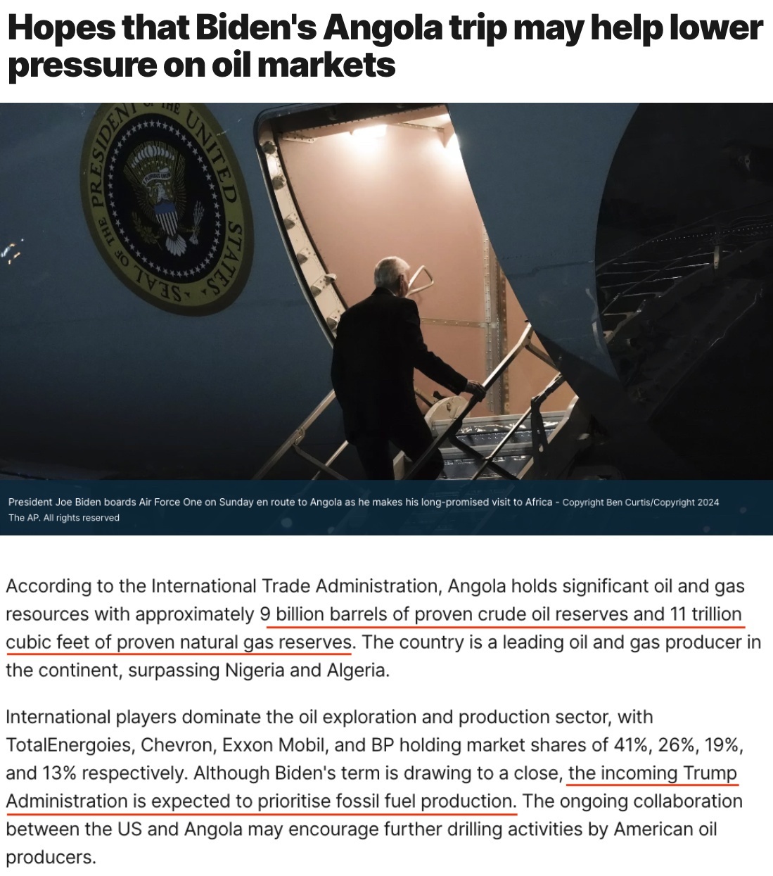 雖然拜登的任期即將結束,但預計即將上任的特朗普政府將優先考慮化石燃料生產。美國和安哥拉之間正在進行的合作可能會鼓勵美國石油生產商進一步開展鑽探活動。