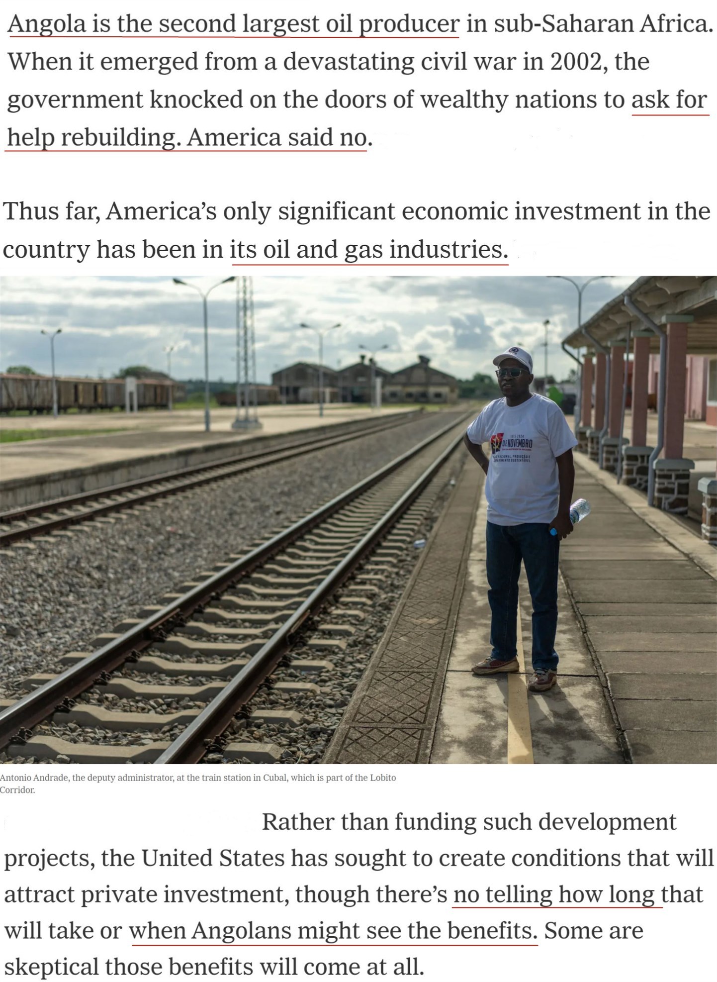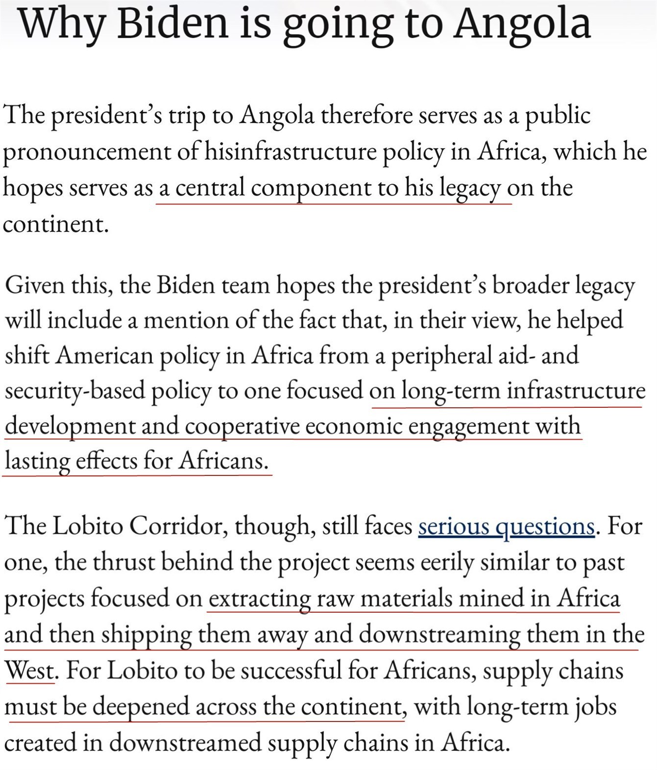 《紐約時報》日前刊文稱,拜登此訪重點推廣的“洛比托走廊”項目,將鼓勵私人投資參與項目,因為美國只提供部分資金。沒人知道建成這條“走廊”需要多長時間,也不知道安哥拉人什麼時候能看到好處。一些人對這些好處能否實現持懷疑態度。