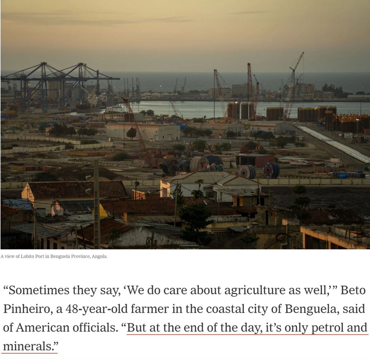 家住安哥拉沿海城市本格拉的48歲農民貝托·皮涅羅說:“有時他們(美國官員)會說,‘我們也關心(安哥拉的)農業’……但歸根結底,(美國關心的)只有石油和礦產。”