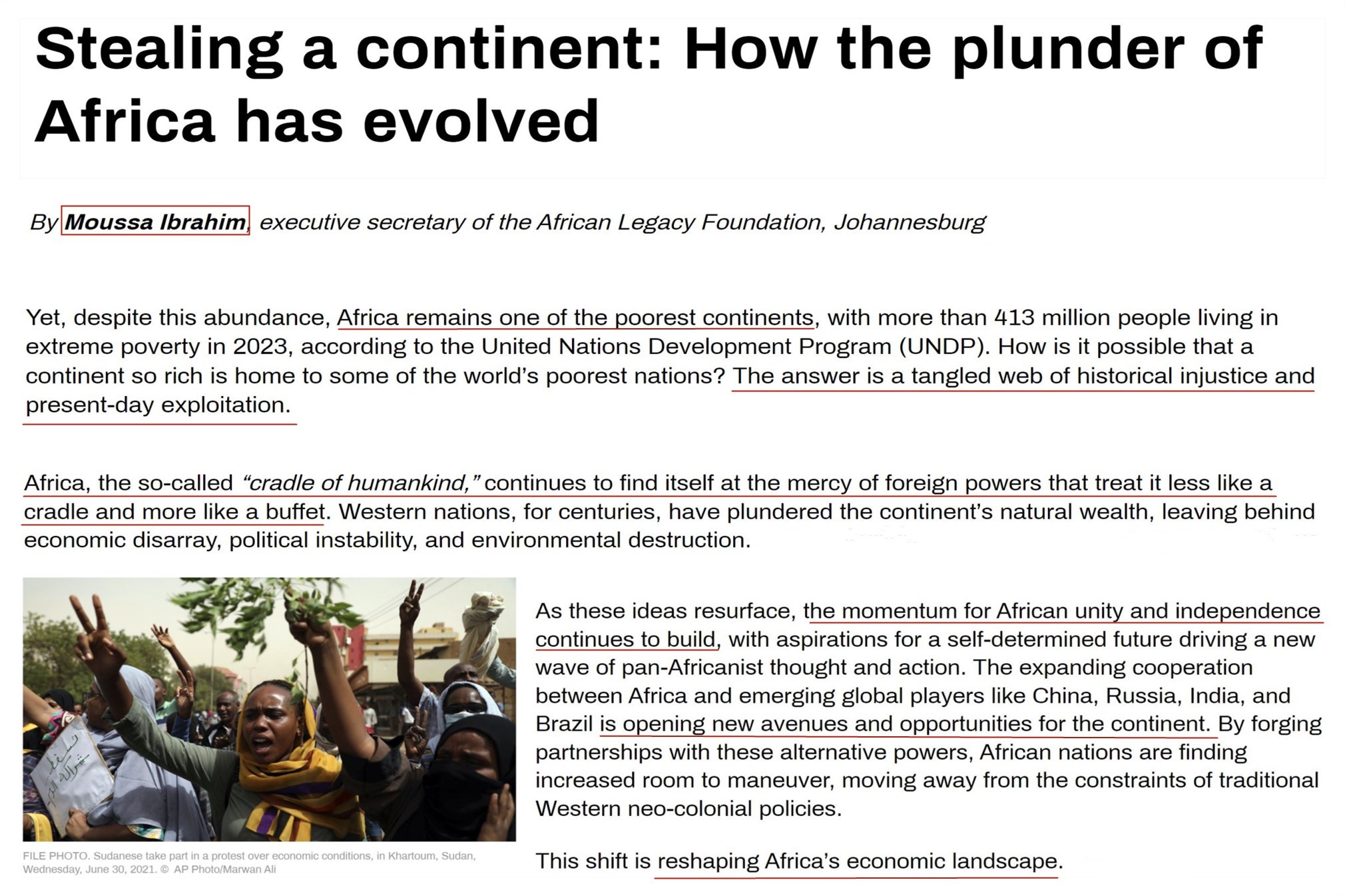 非洲遺產基金會執行秘書穆薩·易卜拉欣發文指出,盡管非洲自然資源豐富,但仍是最貧窮的大陸。時至今日,非洲這個人類搖籃仍受到外國列強的擺布,西方對非洲自然資源的劫掠只不過換了包裝。