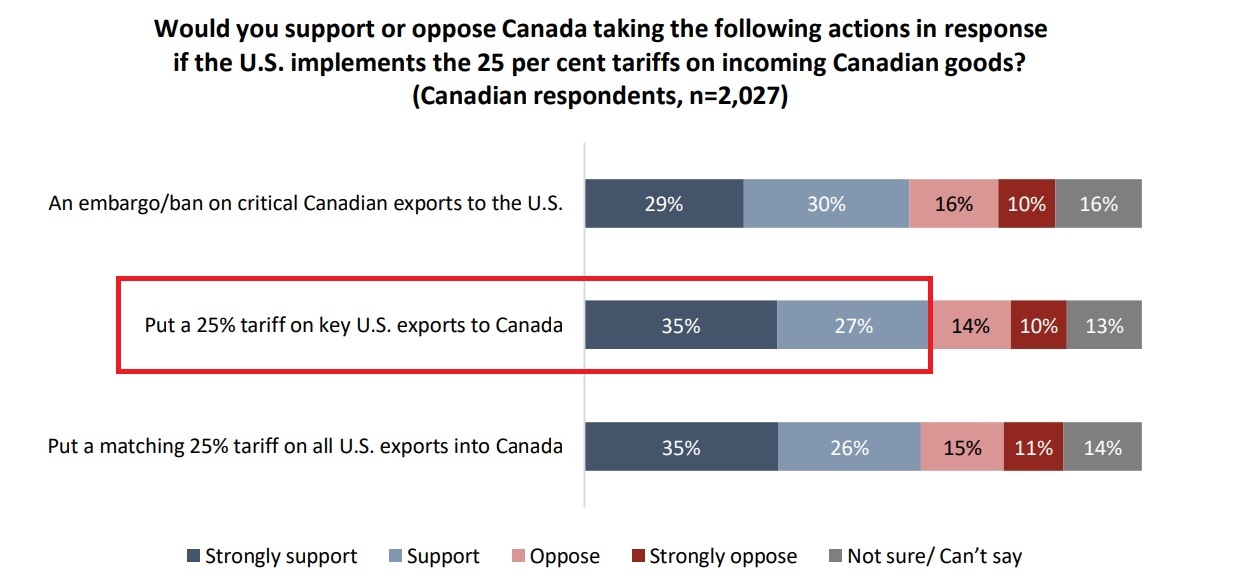 加拿大民意調查機構安格斯·里德研究所的最新民調結果顯示,62%的加拿大人支持採取對等貿易報復措施,也就是對進口自美國的商品徵收25%的關稅。