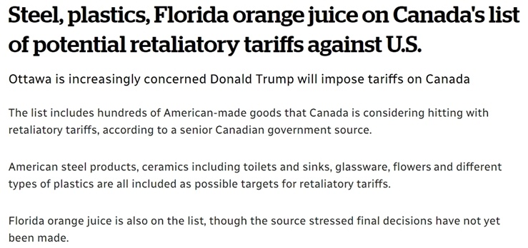 另據媒體報道,加拿大已考慮對來自美國的馬桶和水槽等陶瓷制品,以及部分鋼鐵產品加徵關稅。其他可能被加徵報復性關稅的美國產品還包括玻璃制品、花卉、某些塑料制品以及來自佛羅里達州的橙汁。