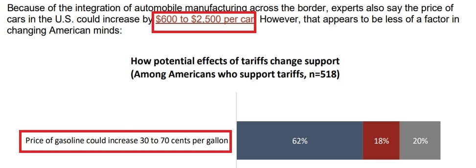 加拿大民意調查機構安格斯·里德研究所表示,對加拿大能源產品加徵25%的關稅,可能導致美國每加侖汽油價格上漲30到70美分,此外,每輛美國汽車的價格可能會上漲600美元到2500美元。