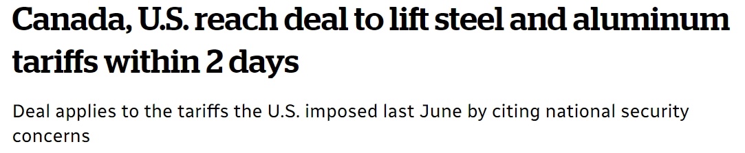 當時,加拿大便對一係列美國商品加徵了等值關稅,這迫使美國重新考慮其政策立場。最終,雙方歷經數月談判後達成協議,美國取消針對加拿大鋼鐵和鋁的額外關稅。