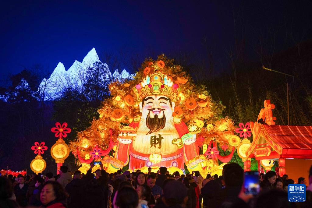1月14日在第31屆自貢國際恐龍燈會上拍攝的彩燈燈組《喜迎財神》。