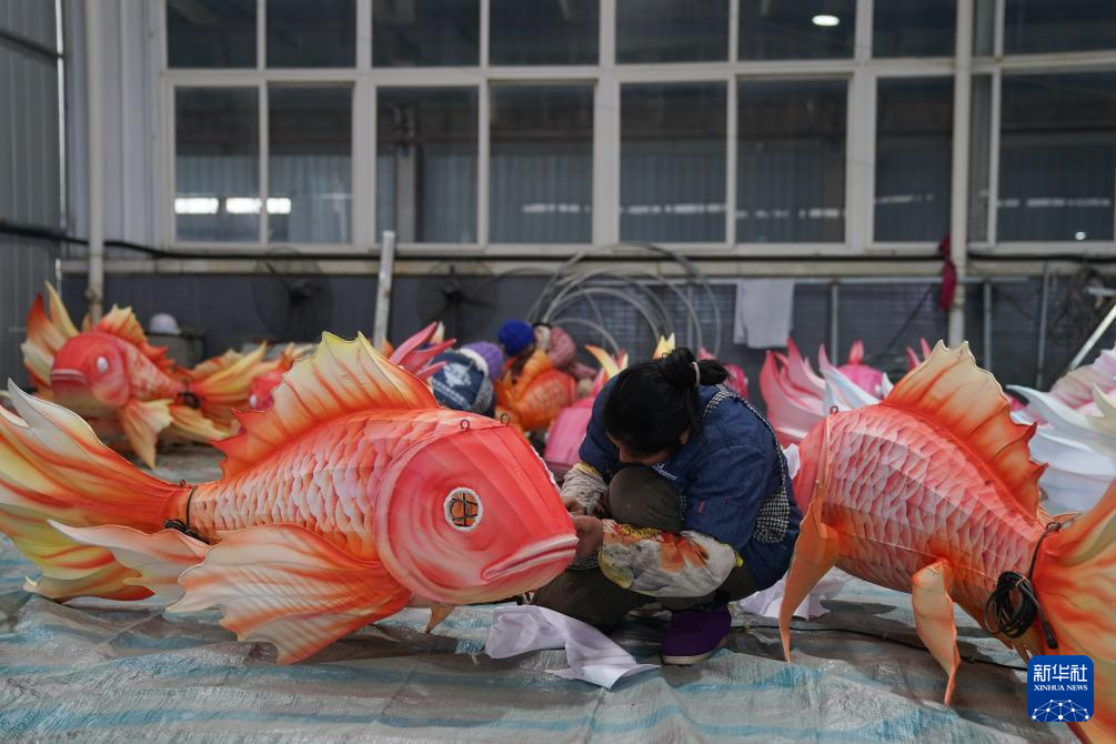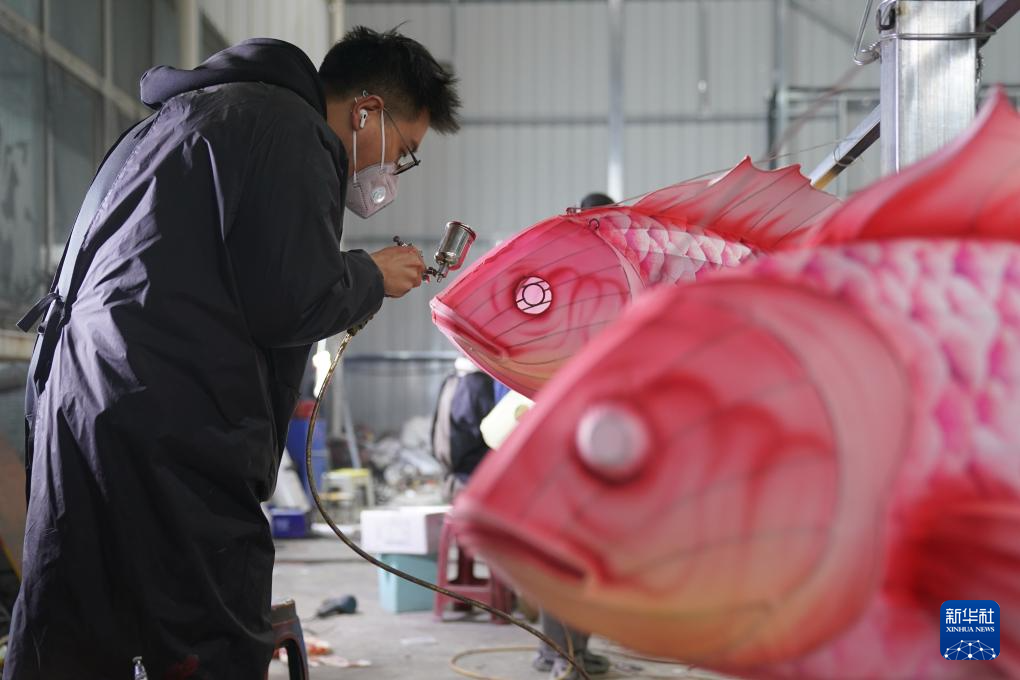 1月14日,在一處彩燈生產車間內,裱糊工對彩燈局部進行裝飾。