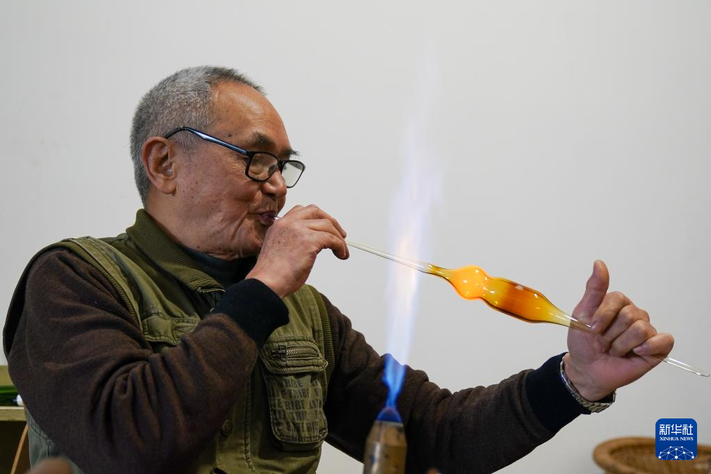 自貢燈會有一項特色燈組“玻璃吹塑燈”,四川省級非物質文化遺產“玻璃吹塑技藝”代表性傳承人彭正華在吹塑成型(1月15日攝)。