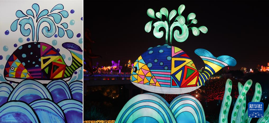 拼版照片:左圖為一名小朋友的繪畫作品《噴水的鯨魚》,右圖為彩燈工匠制作出的彩燈版《噴水的鯨魚》(1月14日攝)。