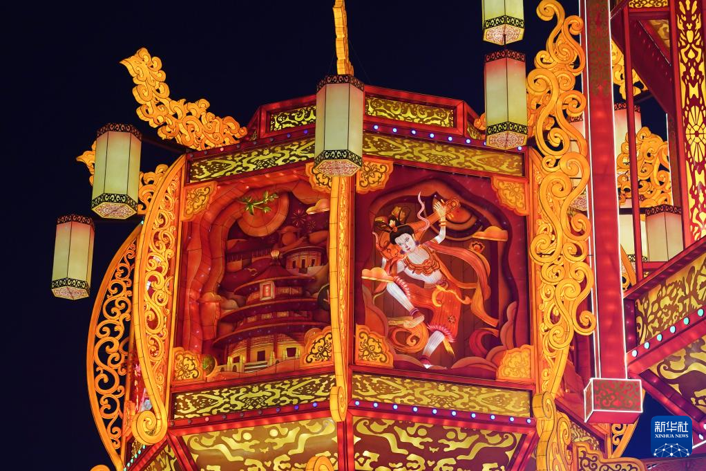 第31屆自貢國際恐龍燈會大門燈組局部“祈年殿”和“敦煌飛天”(1月17日攝)。