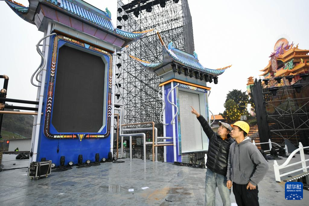 在第31屆自貢國際恐龍燈會主舞臺現場,萬松濤(左)與工作人員商討細節,確保最終的呈現效果(1月14日攝)。此次燈會主舞臺由高級工藝美術師萬松濤和團隊一同設計完成,造型採用了自貢當地一處古建築元素,部分細節由廢舊工業管道等綜合材料組成。