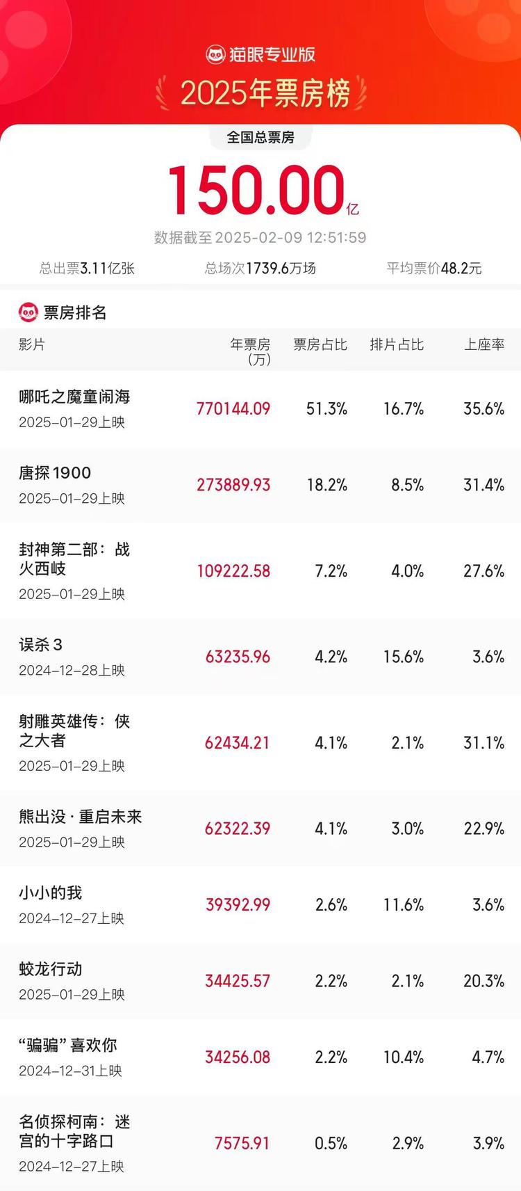 《哪吒之魔童鬧海》以超51.3%的票房佔比